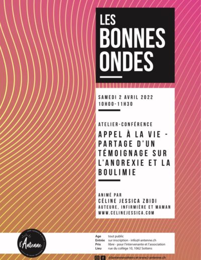 Avril 2022 : Conférence à l’Antenne de Sottens « Les Bondes ondes » pour partager mon témoignage sur l’anorexie et la boulimie