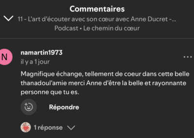 Le chemin du coeur c’est bien plus qu’un podcast pour moi. Ça été une évolution de nom puisque il s’appelait Appel à la vie auparavant. Ça été la libération de ma voix, de ce que je souhaitais exprimer oralement moi qui a toujours écrit mes émotions.