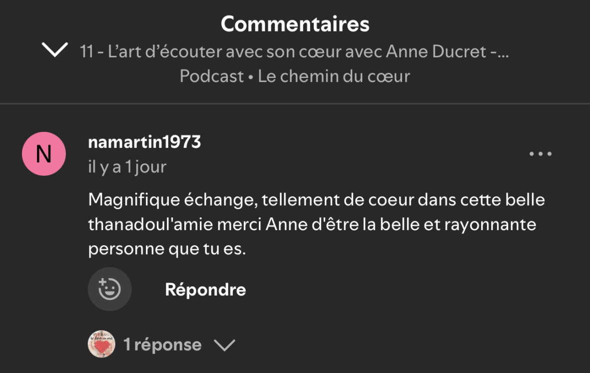 Je ne cherche pas à plaire, la perfection à travers de podcast mais à ouvrir des portes du cœur. À cheminer chacun à sa manière et cela ne touche de pouvoir partager tout ça avec vous.