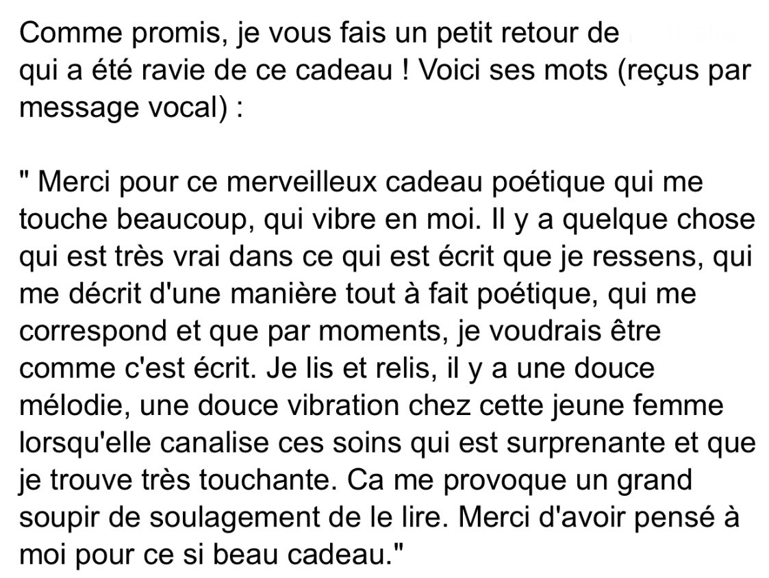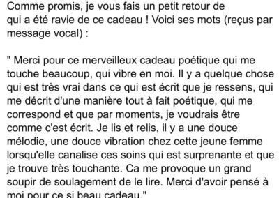 Si vous sentez que c’est juste d’offrir le soin poétique à une autre personne, celle-ci n’a pas besoin de savoir que vous lui faites ce cadeau, mais si je sens que ça bloque je vous proposerai de lui en parler et voir si elle est ouverte à un soin poétique ou non.