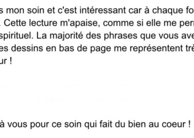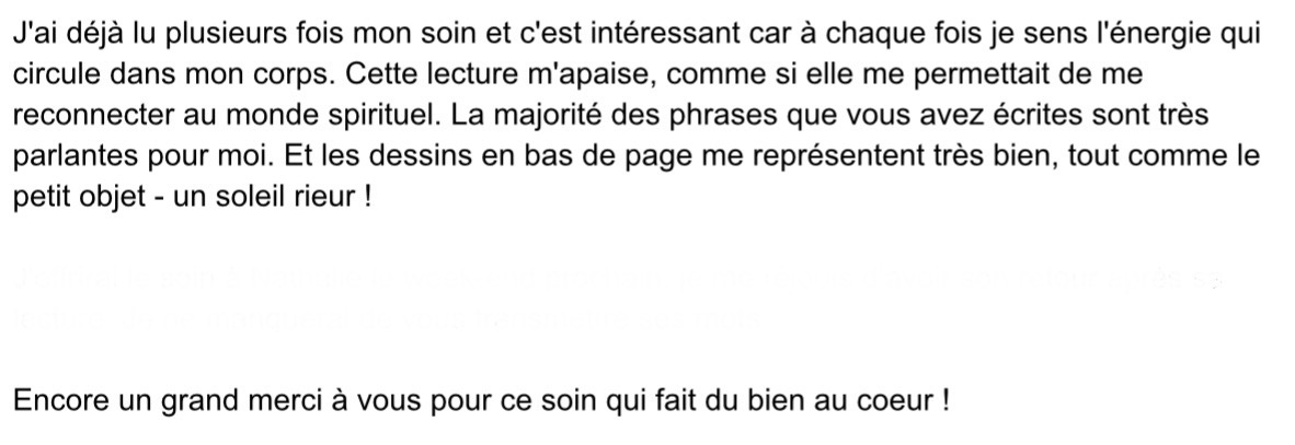 Si vous avez envie de me poser une question avant de procéder au soin, il est tout à fait possible mais je n’aurai pas forcément une réponse directe par rapport à votre question, mais le message qui me traverse sera ce qui est juste de recevoir sur le moment. Vous pouvez m’écrire la question ou simplement vous la poser intérieurement comme intention.